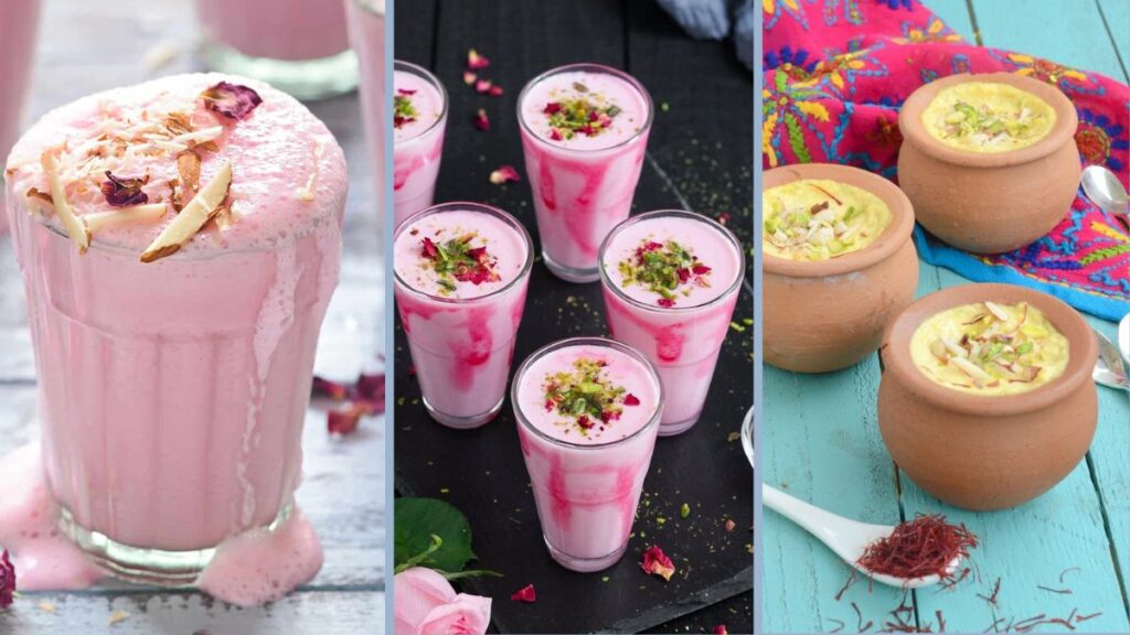 A chilled, creamy beverage made with yogurt and rose syrup, ideal for beating the heat and soothing the senses.